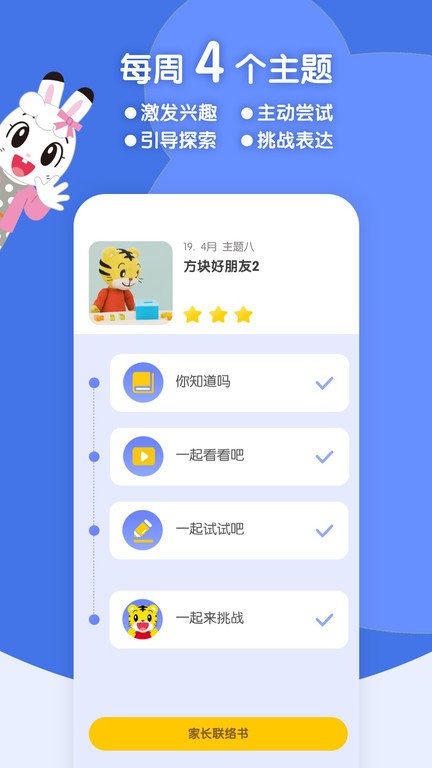 - 每周4个主题:激发兴趣、主动尝试、引导探索、挑战表达。