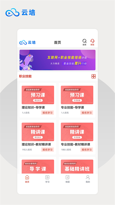 云培是一款专注于通用素质、生活服务、健康服务等多领域技能培训的学习软件。它提供了多样化的线上培训内容,涵盖了各种不同领域的培训资源,满足用户多样的学习需求。