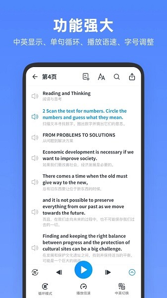 - 功能强大: 支持中英对照显示,单句循环播放,调整播放语速和字号。