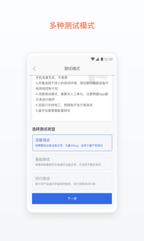 深度测试模式为手动测试,测试人员可以清晰地监测设备状态和App功能状态的变化。相对于基础测试,深度测试更全面,覆盖范围更广,根据测试用例说明,逐一进行自助测试。测试结束后,你也可以预览测试报告。