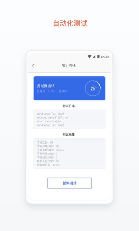 提供自动测试模式,用于快速检测设备基本功能流程问题。这一模式专注于执行基础测试用例,尤其适用于设备的初期调试。测试完成后,你可以查看测试报告。