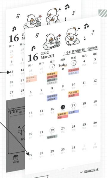 下拉日期即可查看整月计划的时间安排和完成情况,支持左右翻动日历,方便多日期计划的管理。