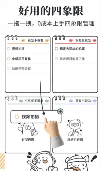采用免费的四象限管理,零学习成本上手高效的时间管理方法。通过长按计划并拖拽,轻松设置计划清单的轻重缓急。