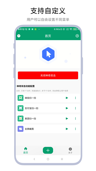 神奇双击是一款实用的安卓工具类应用。它允许用户在无需启动特定应用的情况下,通过双击手机桌面的空白区域,执行各种预定义的操作。这些操作包括快速拨号、快速打开微信扫一扫、轻松截图、快速启动指定应用程序、迅速锁定屏幕等等。