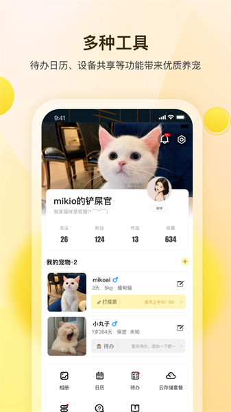 通过日历视图轻松管理宠物的待办事项、日常活动和相册。
