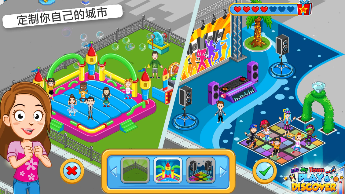 - 爱心收集:使用游戏中收集的爱心解锁炫酷的东西,如房屋和城镇升级、新服装和发型。