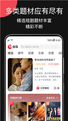 白马剧场app是一个拥有大量短剧资源的平台。每部影片都提供高清播放效果,新内容将定期更新并显示在首页。此外,该应用还根据用户的浏览历史推荐影片,减轻了搜索的繁琐和时间消耗。您还可以查看详尽的排行榜,了解最受欢迎的影片,而且可以在应用内与其他用户分享您的观影想法和评论,一同讨论剧情细节。