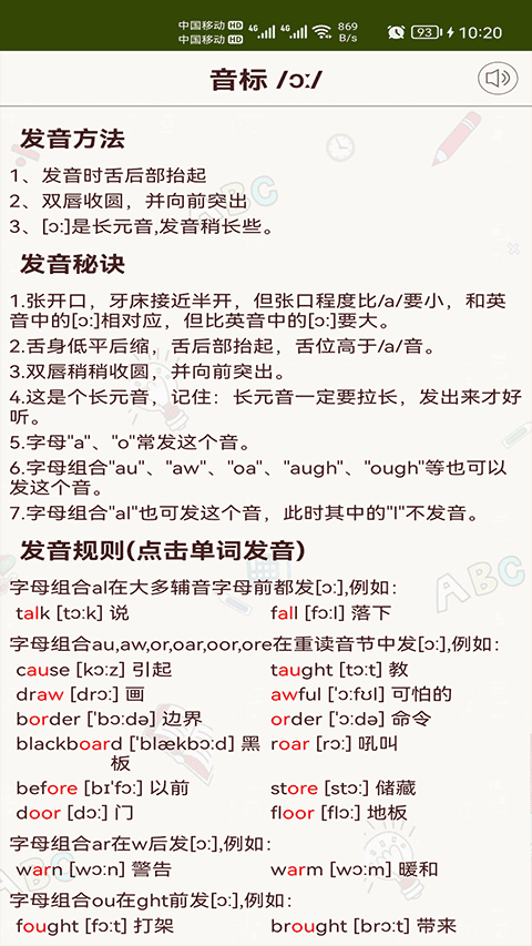 - 然后,在单独的音标具体界面,用户可以及时了解到音标的发音规则和方法,也可以通过语音系统听到标准发音。