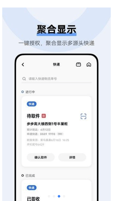 - 聚合显示:一键授权,集中显示多渠道快递信息。